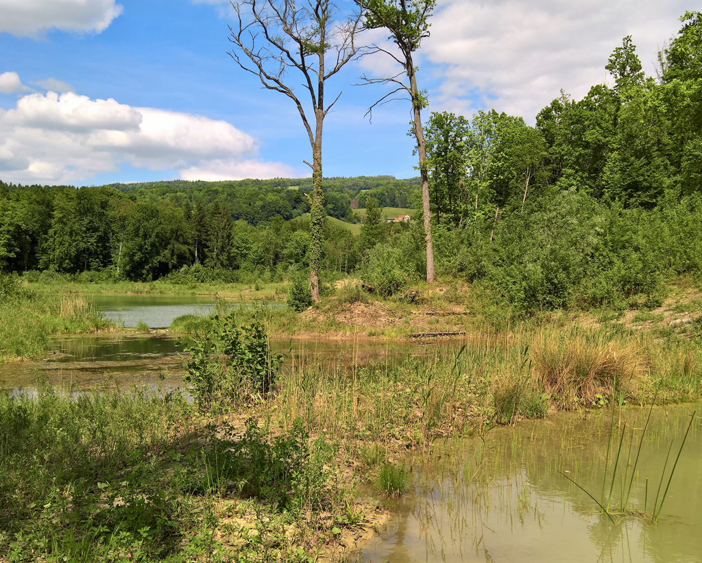 Die Unruhe des Wassers hatte einen kuriosen Effekt. Sie liess uns nämlich in einen überdurchschnittlich ruhigen Wandermodus verfallen. Überaus gemütlich war es, auf verschlungenen Auenpfaden durch den Aargau zu bummeln. Auf einem Holzbrücklein schauten wir lange in den Wald und ins Wasser. Als ich nach geraumer Zeit voranging und zurückschaute, bot sich mir ein malerischer Anblick: Meine vier Wandergenossinnen gruppierten sich wunderbar entspannt zu einem richtig harmonischen Tableau.
