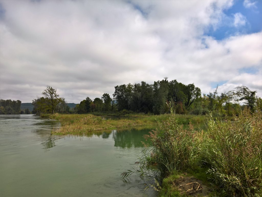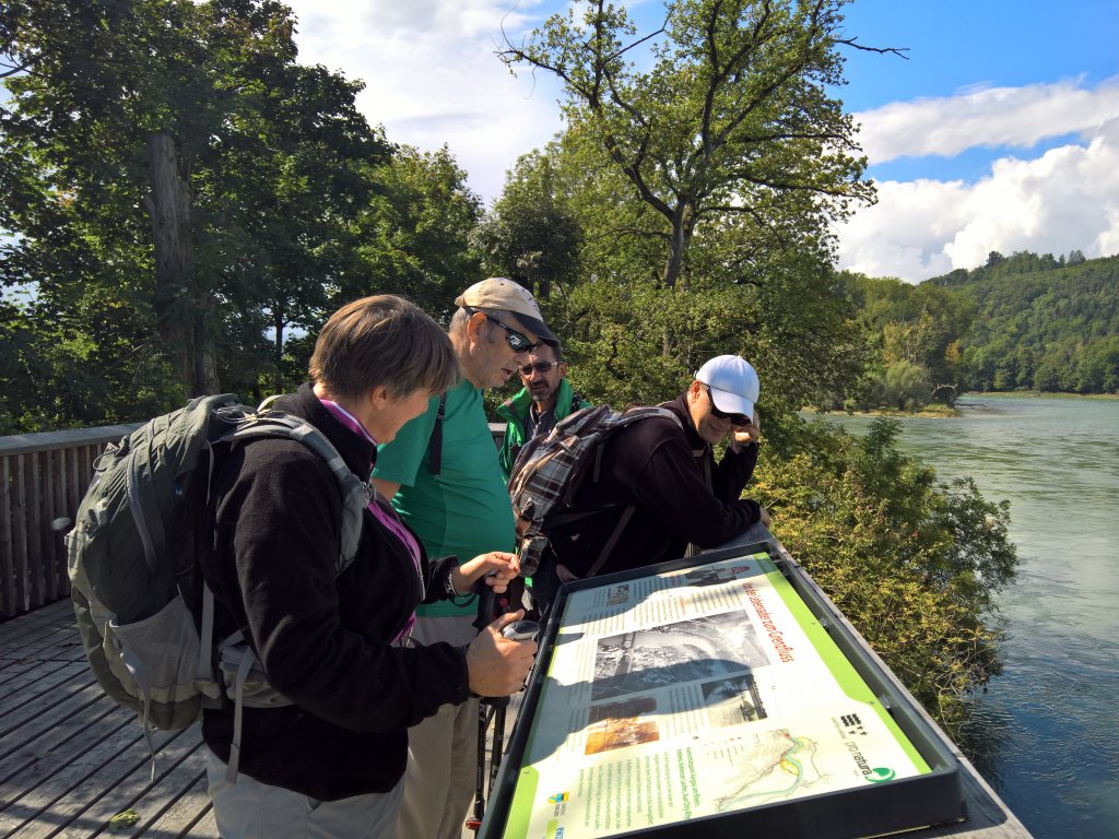 So hätten sich also die Aaronauten an diesem Tag durchaus in Rheinkarnauten (© Martin, danke für diesen Kalauer) verwandeln können, doch höhere Mächten wussten dies zu verhindern. Wir kamen ins Auengebiet Chly Rhy, wo vor einigen Jahren mit viel Aufwand renaturiert worden war. Wir bewunderten die schönen Plätzchen, labten uns am Sonnenschein und studierten die Informationstafel, auf der die Errungenschaften des baggerunterstützten Naturschutzes gewürdigt werden.