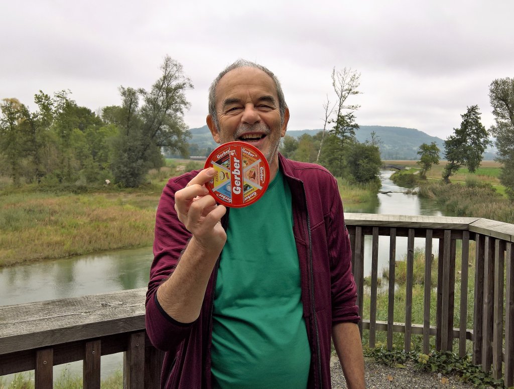 Da wusste ich, was es geschlagen hatte. Zum Glück lag nur einen Steinwurf weit ein hübscher Picknickplatz. In einem Sechseck bildeten dort fünf grosse Steinquader eine Art Rondell – exakt für jede und jeden von uns stand somit ein Sitzplatz bereit. An der Stelle des sechsten Blocks stand ein mächtiger, robuster Stahlgrill. Als der Prospektverteiler begriff, dass sich die Erfüllung seines Drangs nach Einverleibung abzeichnete, gab er sich versöhnlich, griff in seinen Rucksack und zog daraus mit den Worten «Jetzt kommen wir zum absoluten Höhepunkt jeder Wanderung» ein Schachteli Gerberkäse hervor. Hanspeter regte an, das Retro-Picknick mit Ovo-Sport fortzusetzen. Es würde mich nicht erstaunen, wenn die beiden Nostalgiker nächstes Mal mit rot-blauen Mützen der Schweizerischen Kreditanstalt aufkreuzen.