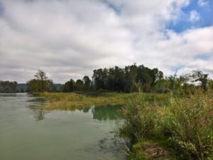 Bald schon erreichten wir die Aare und überschritten die Strassenbrücke, die sich exakt über die Mündung spannt, so dass man den grossartigen Schauplatz der Vereinigung eigentlich nicht so recht mitbekommt. Was mir aber auffiel, waren die Edelkastanien auf dem westlichen Ufer des fusionierten Gewässers. Ich wollte gerade die Vermutung äussern, die wärmeliebenden Bäume würden halt dort gedeihen, wo noch immer die lieblichen Fluten der milden Aare wirken und nicht bereits die garstige Lauge des Rheins das Szepter übernommen hat.