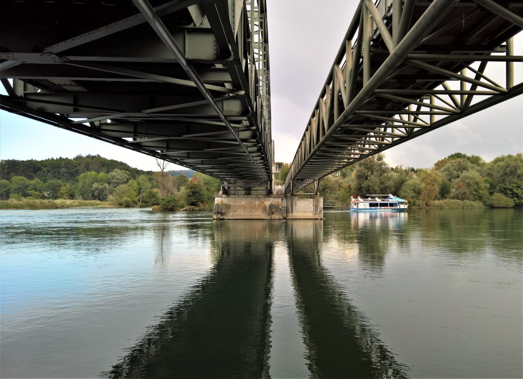 Sogar das Wetter spielte mit. Der Himmel war zunächst grau, an den Hügeln waberten neblig-trübe Schwaden, doch dann riss es auf. Allein, es wurde schon bald grad ein bisschen heftig schön. Wir durchstreiften eine unerwartet hübsche Auenlandschaft, und als wir später durch das Gebiet Laufen kamen, hätte ich eigentlich zugeben müssen, dass die Stromschnellen, das wilde Wasser, der Wald, die hohen Felsen und all diese wunderbaren Dinge wirklich eine grossartige Landschaft formen. Aber da hätte ich ziemlich viel Kreide verspeisen müssen, und dazu war ich grad nicht aufgelegt. Naja, man arbeitet an sich, und jetzt kann ich es ja zugeben: Psst, der Rhein ist auch nicht allzu schlecht!