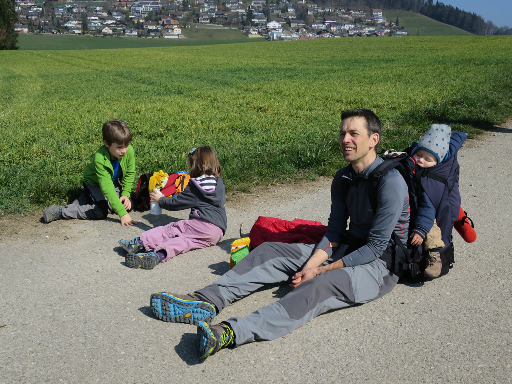 In Oberdiessbach ging es beim Pflegeheim bereits gegen die Mittagszeit und kurz darauf noch in lästiger Weise (Asphalt) bergauf. Urs war es überaus recht, dass die Kinder mit exponentiell zunehmender Dringlichkeit eine Rast anbegehrten. Der Improvisationsdruck war beträchtlich, die Auswahl gering, also nahmen wir mit einem umzäunten Sportplatz Vorlieb, der immerhin mit einigen Sitzbänken ausgestattet war. Wir spiesen in einer einigermassen reglementierten Zone. Das auf einer Tafel eingeforderte Töffliverbot vermochten wir problemlos einzuhalten, ebenso die Bestimmung zur Nachtruhe, und unser vorösterlicher Eiertütsch dürfte den Oberdiessbacher Dorffrieden kaum beeinträchtigt haben.