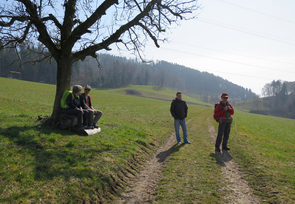 Nach der Mittagsrast wanderten wir noch ein paar Minuten auf Asphalt weiter, danach wurde es richtig lauschig. Den Auftakt bildete eine romantische Sitzbank an aussichtsreicher Lage. Sie wäre eigentlich ein idealer Picknickplatz gewesen, allerdings nicht für unsere Gruppe, sondern nur für maximal anderthalb Personen. Urs, der offenbar bereits wieder für eine Pause zu haben gewesen wäre, konstatierte jedenfalls mit überdeutlicher Begeisterung: «Ein richtiges Schmusebänkli!!»
