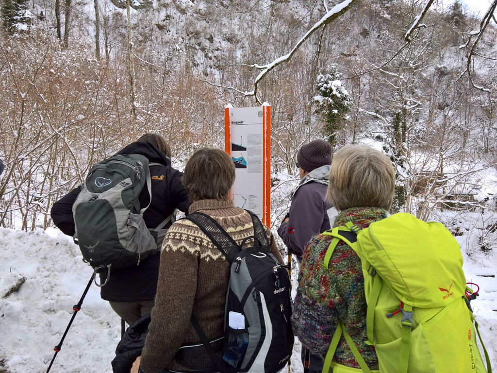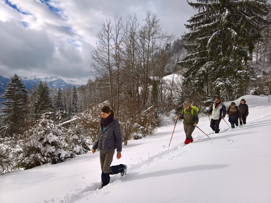 Vom Fehlerteufel zurück zu den Engeln. Wir parlierten heute Engelssprache bzw. englisch, weil Ana dabei war, die des Deutschen noch nicht so mächtig ist wie des Wanderns. Schon bald verliessen wir die gepfadeten Strecken und betraten himmlische Gefilde. Totale Stille herrschte, eine blendend helle Schneedecke lag auf den Wiesen, die Bäume waren prachtvoll verschneit. Einzig Barbara erklärte, von der zauberhaften Winterlandschaft herzlich wenig mitzubekommen, weil sich ihre Brillengläser einen intensiven Wettbewerb in permanentem Highspeed-Beschlagen lieferten.
