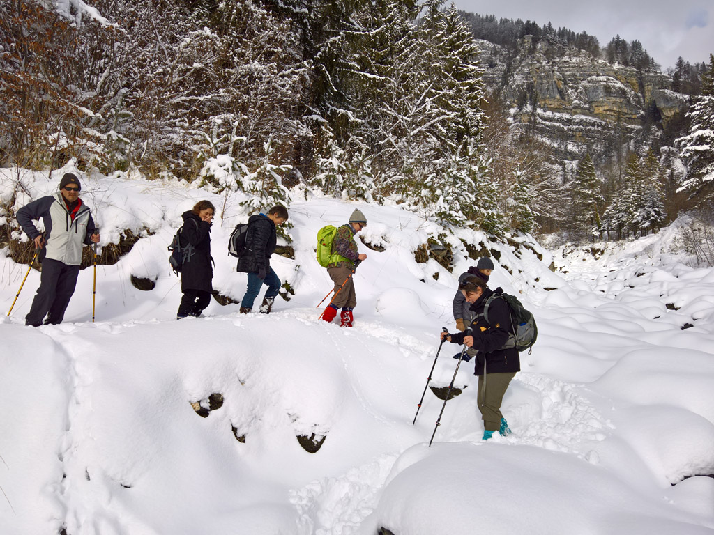 Nach der Mittagspause verzichteten wir auf den Abstecher hinauf zum Ausleitbauwerk des Glyssibachs. Das ist zwar ein recht spektakulärer Schauplatz, aber noch anziehender schien uns das verschneite Tälchen nahe des Weilers Glyssen. Wir pflügten durch die jungfräuliche Schneedecke einen Hang hinunter und durchquerten ein Wäldchen, das – man kann es nicht anders sagen – von gellender Stille durchdrungen war. Wir kamen uns vor wie ein astronautisches Expeditionskorps, das in ferner Einsamkeit die ersten Pionierschritte auf einem unerforschten Planeten unternimmt.