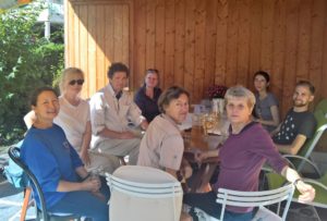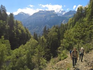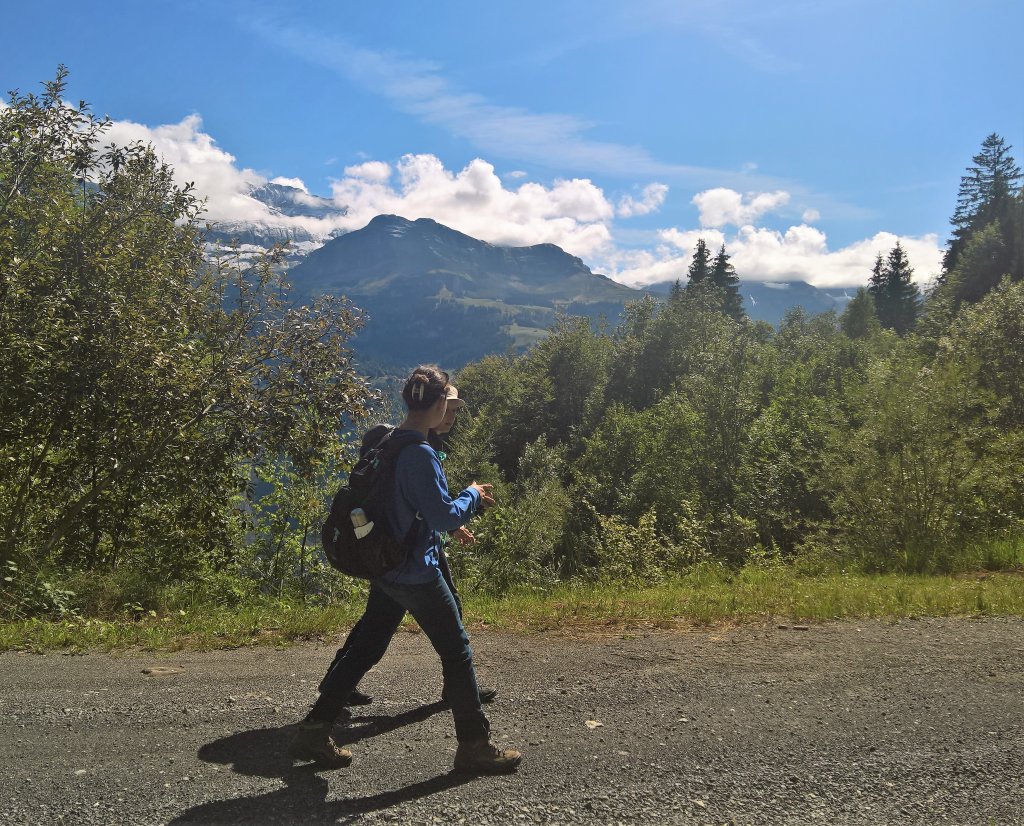 Nach dieser feurigen Ansprache schaute ich mich zuversichtlich um, doch mir schien, man blicke mich eher verständnislos an. Na denn los! Wir begannen zu marschieren, dem Brienzersee entlang, zum Wasserlauf von Schwanderbach und Lammbach, dann durch den Wald aufwärts zum Schwander Waldschwimmbad. Dort hatten wir bereits 120 (in Worten: hundertzwanzig) Höhenmeter geschafft. Wärme und Erleichterung breiteten sich aus, Pullover verschwanden in den Rucksäcken, Trinkflaschen kamen zum Vorschein, und Marie-Louise begann Zwetschgen aus ihrem Garten anzubieten, was, wie sie zugab, nicht vollkommen uneigennützig war, weil sie sich davon ein vermindertes Rucksackgewicht und somit erleichtertes Marschieren versprach.