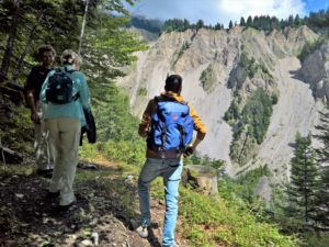 Die Wanderung wurde fortgesetzt. Es ging in den Lammbachgraben, eine Landschaft, die wilder ist als eine tollwütige Rock-Gang auf schweren Motorrädern. Alles bröckelt und rumpelt dort. Anderthalb Millionen Kubikmeter Gestein schlummern einem grossen Regenfall entgegen, um eines Tages als gewaltiger Murgang talwärts zu stürzen. Der Weg wurde steil, Keuchen setzte ein, Versagensängste stiegen wie Moderwolken aus einem trüben Sumpf empor – mit einem Wort: Der Aufstiegsstress griff endgültig um sich.