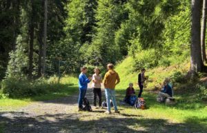 Etwas später erreichte die mittlerweile gestärkte Armada den Wendepunkt. Wir naschten Brombeeren, warfen einen letzten Blick in die Mondlandschaft des Lammbachgrabens, bummelten bei geringem Aufstieg einer Lichtung entlang zum Treichiwald, wo ich verkündete, wir hätten soeben den höchsten Punkt der Route erklommen. Triumphgeheul, Einander-in-die-Arme-Fallen und überschwängliche Glücksbekundungen setzten ein. Man musste förmlich aufpassen, nicht eine Überdosis an Endorphinen einzuatmen.