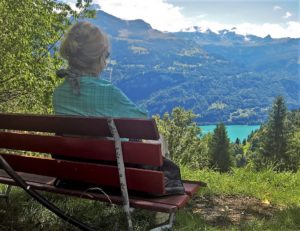 Der Abstieg begann, wie der Aufstieg grösstenteils verlaufen war: im Wald. Ich muss zugeben, meine Routenwahl war mit einer gewissen landschaftlichen Einengung verbunden. Umso grösser war dann der Kontrast, als wir im Unterägerdi zwischen den Bäumen hervor auf Weideland traten: Wir erblickten das Schwarzhorn und die Faulhornkette und sahen in der Tiefe den Brienzersee leuchten. Wenig später kamen wir an ein Hüttchen, vor dem sich ein umzäuntes Gärtchen befand, in dem allerlei Gemüse gedieh. Nebenan stand ein Bänkchen. «Das ist das Paradies», stellte Dina fest und setzte sich.