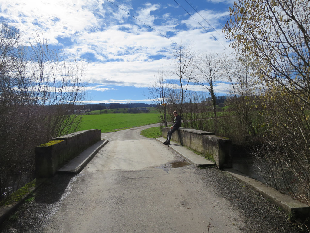 Ausgangs Lenzburg kamen der Frühling und die Farben: Unten wurde es zügig grün, oben am Himmel langsam blau. Der Bach zog kräftig und quirlig an uns vorbei, denn er hat ganz schön viel Gefälle, aber davon merkt man eigentlich nichts: Auch wenn man in der Gegenrichtung unterwegs ist, geht es kaum aufwärts. Wir kamen also gut voran.