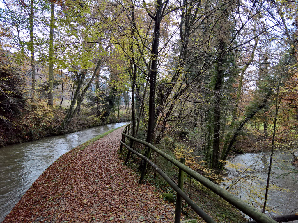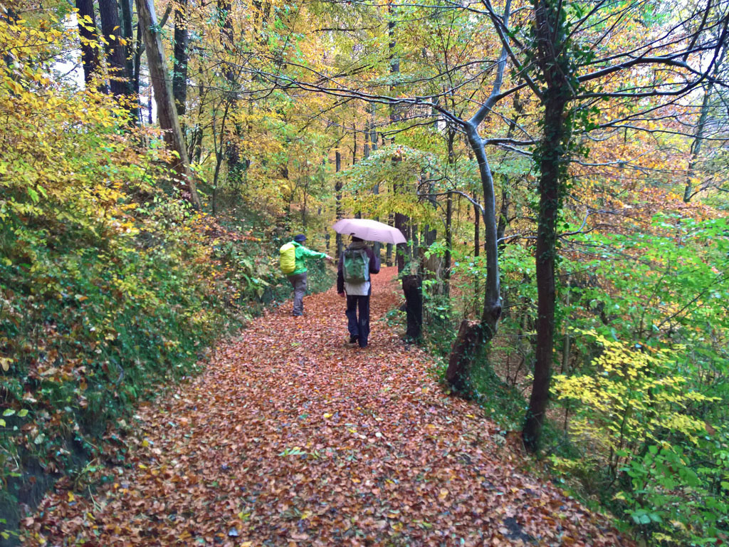 Es kam wieder einmal ziemlich anders. Anfänglich regnete es zwar ein bisschen, doch das steigerte den Wanderreiz nur noch: Der Wind hatte eine Menge Blätter von den Bäumen gefegt, die jetzt überall grün-gelb-rote Farbkleckse in die Landschaft setzten und sich dabei vom Regen eine fast übernatürliche Frische verleihen liessen. Das bunte Laub war ein unerwartet intensiver Augenschmaus.