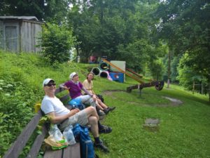 Als wir mittags zur Hohlinde kamen, lag ein Regelverstoss in der Luft. Doch das Ausflugsrestaurant war dermassen gut frequentiert, dass sich sämtliche Aaronauten brav ihrem mitgebrachten Picknick widmeten. Allerdings brach eine interessante Meinungsverschiedenheit um den Standort aus. Die alten Hasen – Cornelia, Monika und Stefan – machten kein Federlesens, setzten sich auf ein Bänkchen beim Spielplatz neben der Beiz und nahmen die Erledigung ihrer Sandwichs in Angriff. Die neuen Hasen hingegen – Isabella, Monica und Fritz – zauderten, drucksten herum und zottelten schliesslich davon.