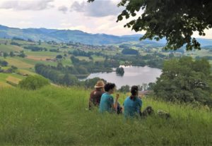 Für Monica war der Fall freilich ebenso klar: «Da hat’s ein Picknickverbot, also braucht man nicht lange zu fackeln.» Aha, es ging ihr weder um die nahen Parkplätze oder um allfälligen Friteusengeruch noch um Landschaftsästhetik oder Feng-Shui, sondern einfach um Rücksicht auf den Hohlinden-Wirt. Man könnte solches Verhalten durchaus als löblich bewerten. Doch als ich dann das Picknickplätzchen der neuen Hasen inspizierte, erkannte ich, dass da auch eine gewisse Portion Eigennutz im Spiel war. Im Casting um den schönsten Standort für die Mittagspause hatten sie die Konkurrenz beim Restaurant-Spielplatz nämlich gnadenlos ausgestochen: Sie genossen einen sagenhaften Ausblick auf das Stockental und den Amsoldingersee.