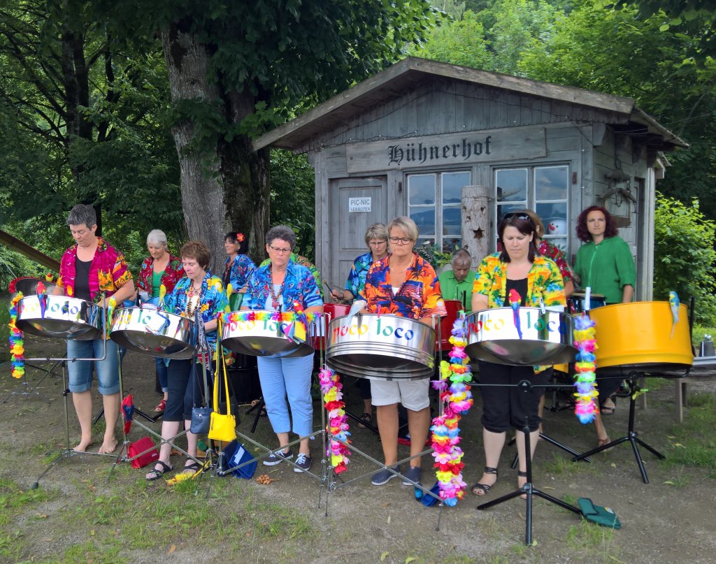 Ehe wir wieder aufbrachen, sah ich mich zu einem kleinen Outing veranlasst. Ich habe nämlich ein paar Jahre Schlagzeug gespielt in einer Steel-Band, die just an diesem Tag auf der Hohlinde ein Konzert gab. Die Damen luden mich ein, mit ihnen zusammen doch ein, zwei Stücke zu spielen, und ich liess mich blöderweise nicht lange bitten. Also setzte ich mich nach monatelanger Trommelabstinenz an die Kübel. Ich konnte gerade noch entsetzt erkennen, dass es sich nicht um ein normales Drum-Set, sondern um ein vertikal angeordnetes Cocktail-Schlagzeug handelte, und da fing schon das Stück an.