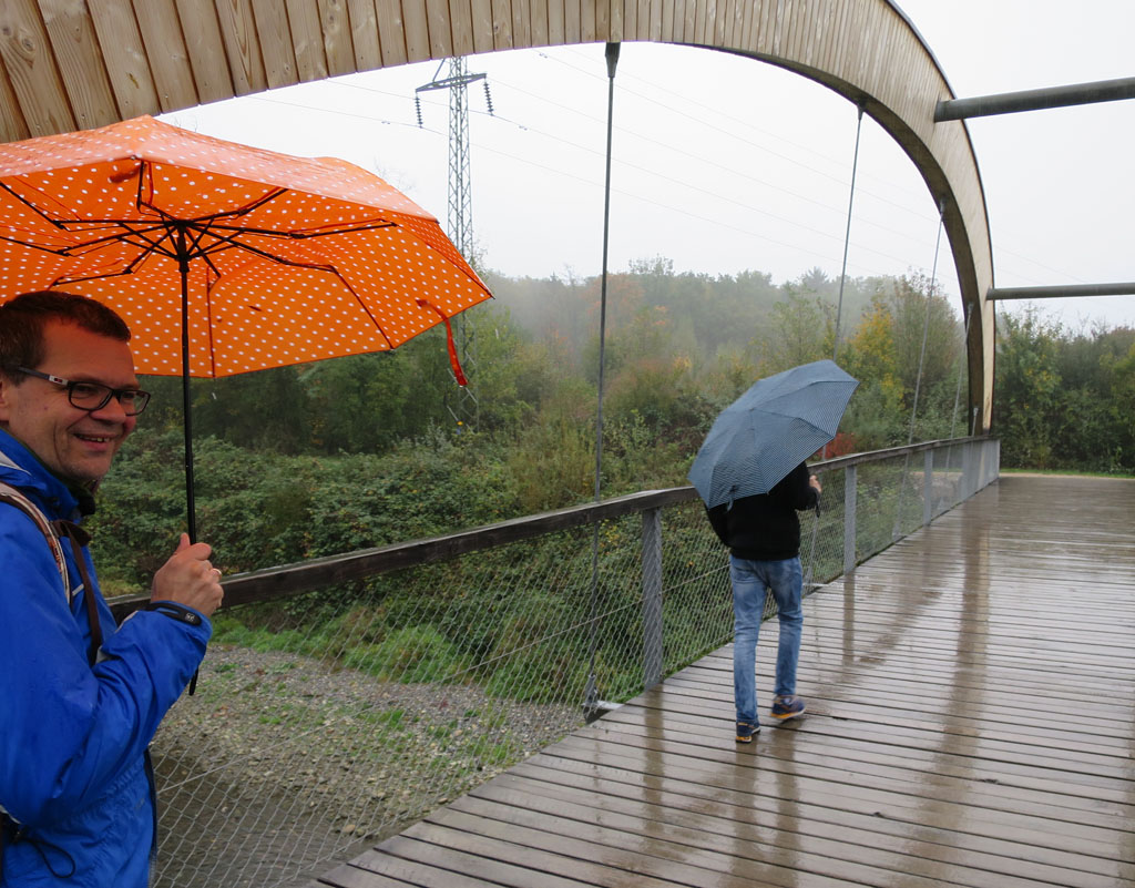 Etappe Nr. 17 am 18. Oktober 2015 brachte eine weitere Premiere: Erstmals fielen während unserer Aare-Wanderung Regentropfen. Und dies gleich richtig fleissig. Allerdings lag es nicht am Wetter, dass der Dreimännertrupp am Schluss komplett durchnässt war.