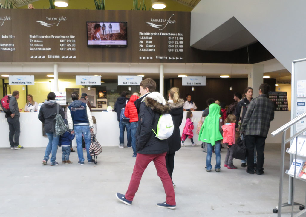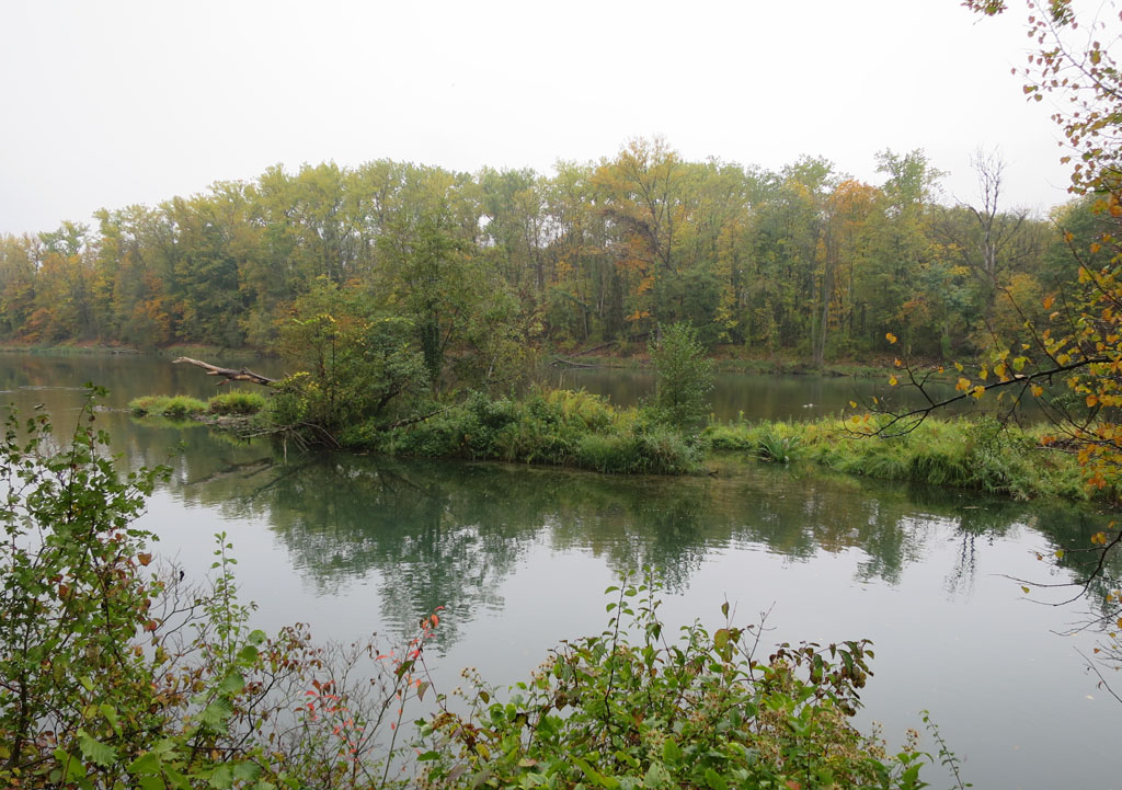 Möge er im Pfefferland bleiben und die Aare weiterhin den stillen Geniessern überlassen. Die Landschaft glänzte frisch gewaschen. Auenwälder am gegenüberliegenden Ufer zeigten sich in dezent buntem Blätterkleid. Da und dort spreizte ein Reiher gelassen seine Flügel. Die Welt sah aus, wie wenn ein flämischer Meister sie gemalt hätte. Schon bei Wildegg hatte der Regen nachgelassen. Finns Schirm war nahezu in Auflösung begriffen. Jetzt konnte er die Trümmer getrost verräumen. Wir näherten uns der finalen Nässe. Schon rückte das Schinznach Stauwehr von Schinznach in Sichtweite. Ein kleiner Abstieg, ein paar Schritte über den Golfplatz, danach standen wir vor dem Thermalbad Schinznach.
