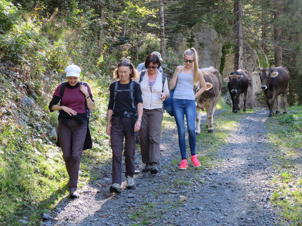 Sehr kontaktfreudig zeigte sich eine Gruppe von Kälbern am Weg. Besonders manchen weiblichen Mitgliedern der Aare-Wandergruppe war die Zutraulichkeit indessen bald einmal zu viel. Mit Bildern von aufgespiessten Toreros vor dem geistigen Auge hasteten sie dem rettenden Gatter zu.