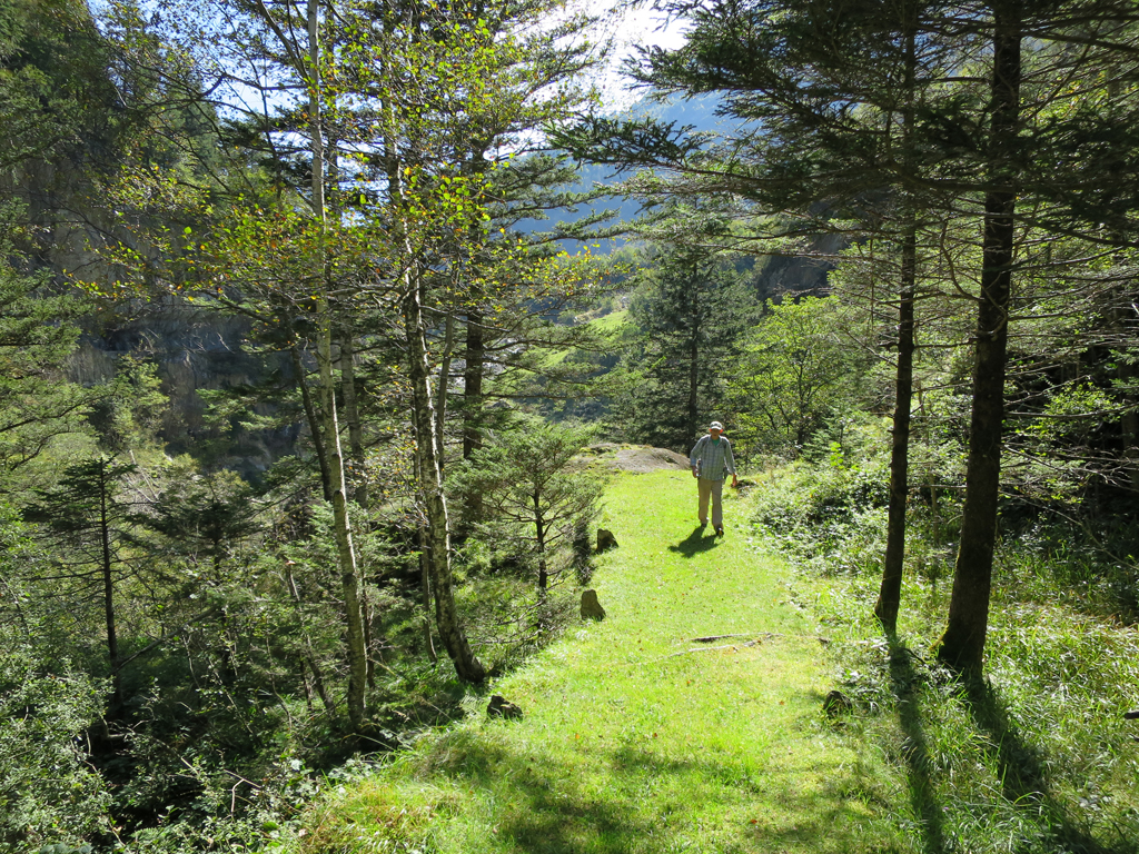 Auf dem alten Grimselweg gelangten wir zur eindrücklichen Passage der Sprengfluh. Gleich vier Generationen der Passroute kann man dort entdecken: Neben dem heutigen Saumweg, auf dem man selber steht, sieht man auf der anderen Seite der Aare die alte Passstrasse und dahinter die teilweise in einem Tunnel verlaufende neue Strasse. An der senkrechten Felswand über dem Fluss finden sich zudem noch Spuren eines ersten Passwegs, mit dem dieser einst praktisch unüberwindliche Abschnitt bewältigt wurde.