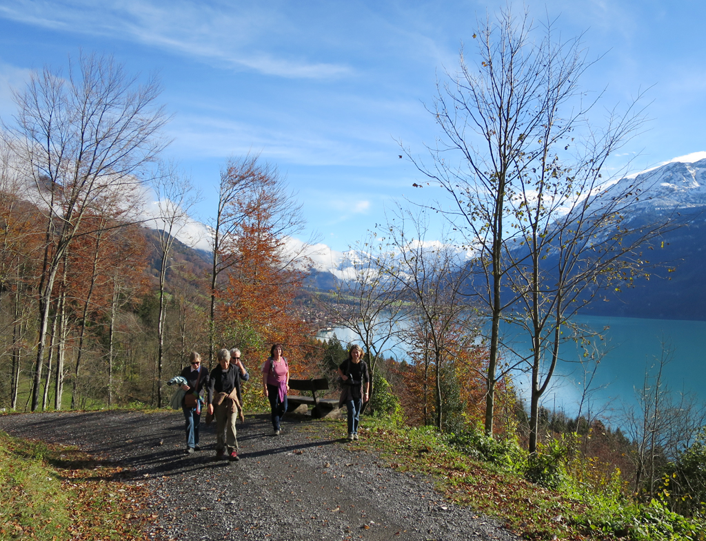 Deshalb konnten wir die Buchenwälder ungestört und in aller Stille geniessen. Manche Bäume hatten ihre Blätter zwar bereits abgeworfen und gaben dadurch schöne Tiefblicke zum See frei. Andere hingegen setzten noch immer leuchtend gelbe, orange und rote Farbtupfer, die in einem eigenartigen Kontrast zur Kulisse der verschneiten Faulhornkette standen.