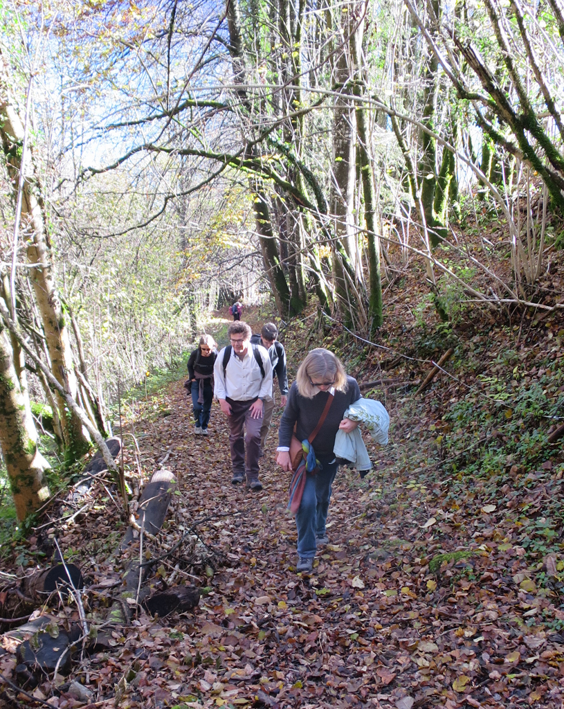 Müsste der Boden nach dem nächtlichen Dauerregen eigentlich nicht ziemlich glitschig sein? Wenigstens in dieser Frage gewannen wir rasch Klarheit: Im Abstieg oberhalb der Bahnlinie haute es mehrere von uns fast auf den Kiel. Selber schuld, wenn man den Beistand des Himmels unvorsichtigerweise aufkündigt. In unserem tumben Fehlgehen hatten wir nämlich die als Teilstück des Jakobswegs markierte Wanderroute verlassen.