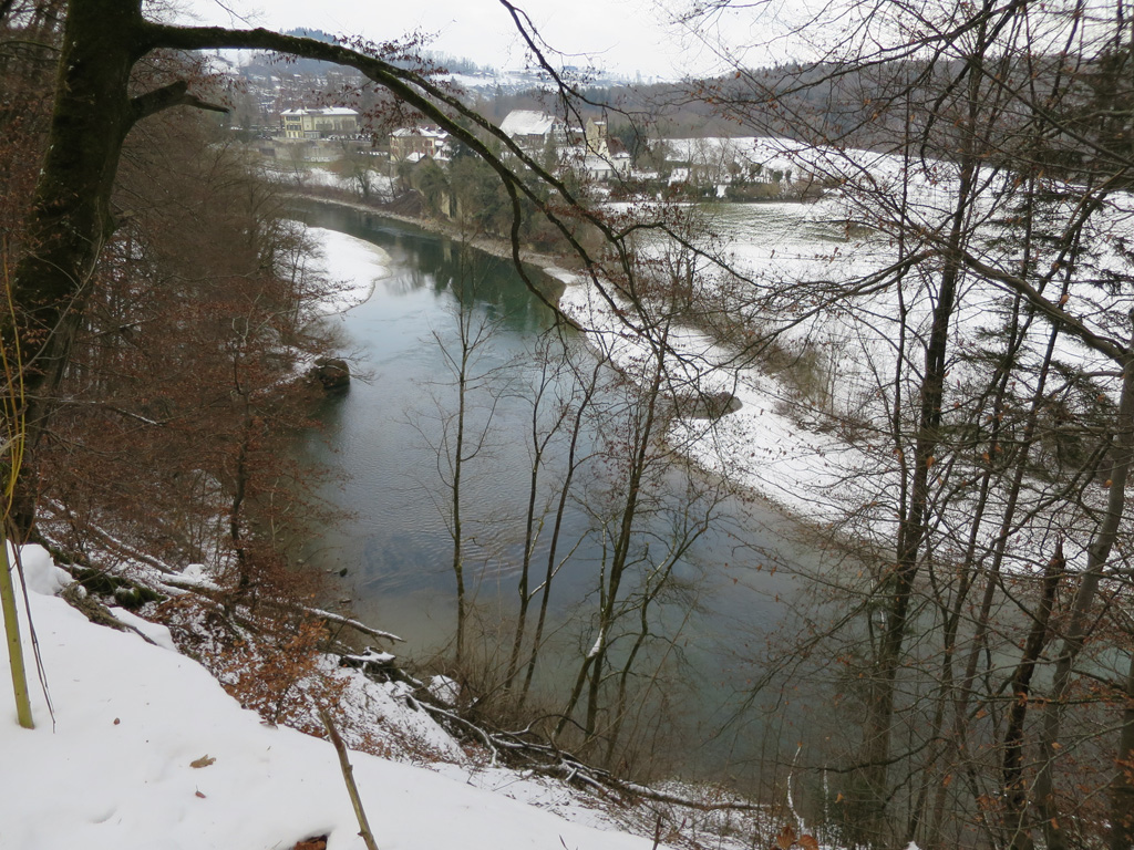 Die Aare ist jedes Mal für eine Überraschung gut. Nach sieben Etappen sollte man meinen, das Wesen dieses Flusses sei nun eigentlich ergründet und die Angelegenheit könne abgehakt werden. Doch dann bummelten wir durch den Reichenbachwald, sahen in der Tiefe das Wasser glitzern, und da begannen wir Aaronauten uns vorzustellen, wir seien am Amazonas. Aus unerfindlichen Gründen hatte es im äquatorialen Südamerika einen Wintereinbruch gegeben, auf den Wegen lag Schnee, doch dort unten zog der Strom mit unergründlichem Schweigen seine Bahn. All die gefährlichen, garantiert menschenfressenden Tiere, die sich in seinen Fluten bargen, blieben unserem Blick momentan verborgen. Etwas befremdend waren einzig die goldenen Tafeln im Wald, die zu irgendeinem Themenweg gehörten – vermutlich das Ergebnis eines Selbstverwirklichungskurses für Förster.