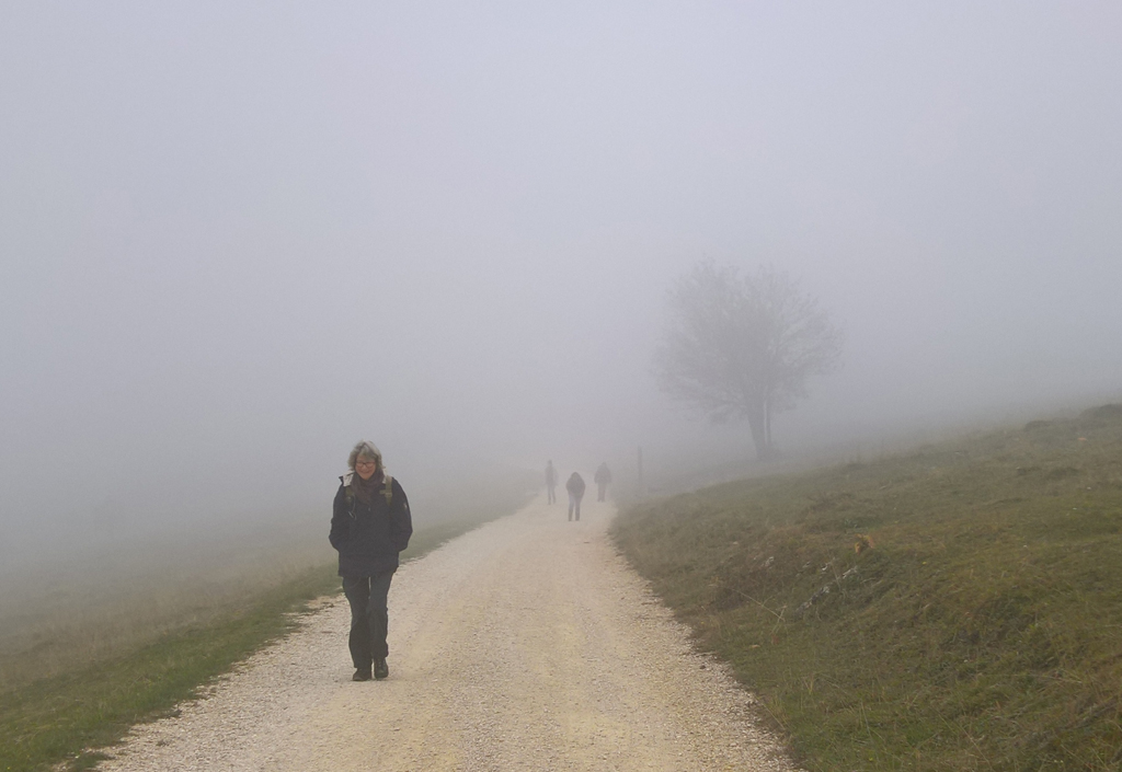 Am Malsenberg erreichten wir die Krete der zweiten Jurakette. Vom hier sonst üblichen Weitblick war heute nichts zu sehen; wir waren ins Zentrum der Wolken vorgedrungen. Nebel zog über die Weiden und verwandelte die vereinzelt herumstehenden Bäume in mystische Gestalten. Später begann es zu tröpfeln.