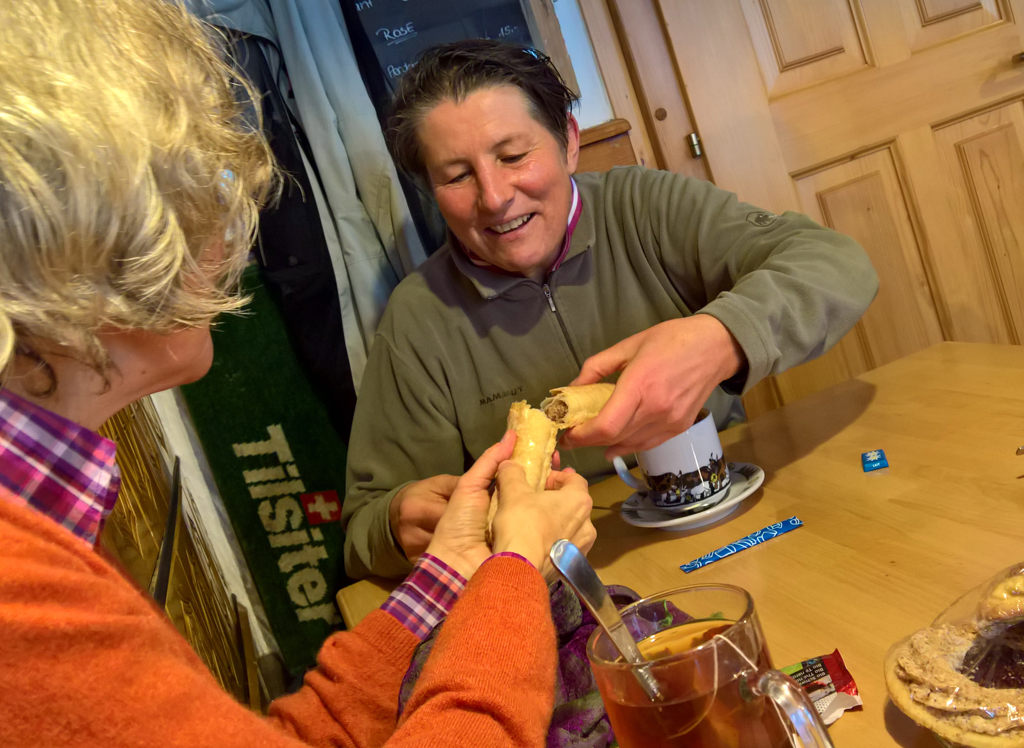 Später entschlossen wir uns dann doch, gegen Regel, Konzept und Usanz zu verstossen: Wir gingen uns im Hinter Brandberg aufwärmen. Die Bergbeiz war übervoll und überheizt, aber wir bekamen dennoch Platz und Trunk. Auf den Tischen lagen gewaltige armierte Teigrohre, die vom Wirt als hausgemachte Nussgipfel gepriesen wurden. Kinder kamen und verwickelten Cornelia sogleich in papierene Schnippschnapp-Spiele.