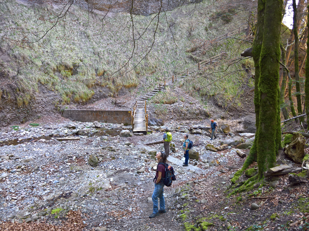 Die nächste Warnung ignorierten wir erneut frohgemut: «Bei Schneeschmelze im Frühling und bei Regenwetter ist das Überschreiten der Wildbäche erschwert oder gar unmöglich.» Der nahe Riderbach erwies sich als eher kümmerliches Wässerchen. Neckischerweise gab es an der Stelle, wo er sich in einen Wasserfall verwandelt, weder Tafeln noch Geländer. Dabei kann man sich dort auf recht elegante und extrem unkomplizierte Weise 30 m senkrecht in die Tiefe stürzen: Es genügt, wenn man an die Geländekante tritt und dann noch ein Schrittchen weiter geht. Evi kriegte jedenfalls sichtlich weiche Knie, als sie ihren tapferen (bzw. leichtsinnigen) Wandergenossinnen und –genossen beim Auskosten der Tiefblicke zuschaute.