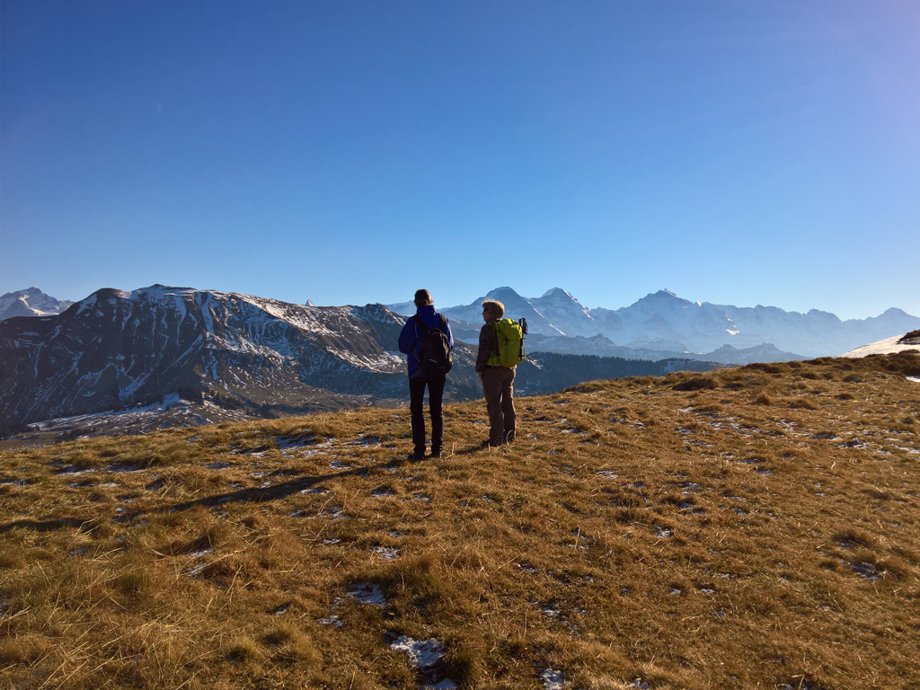 Winterwandern ohne Schnee – funktioniert das? In manchen Skigebieten denkt man scheint’s schon darüber nach, ob man Winterwanderwege nicht ebenfalls beschneien sollte, grad so wie Skipisten. Statt dem Schnee nachzujagen, wählten die Aaronauten ein anderes Verfahren. Sie liessen am 4. Dezember 2016 das nebeldurchseuchte Mittelland hinter sich, strebten in die Höhe und streiften durch das Tal des Lombachs. Föhnstürme hatten die Gegend wenige Tage zuvor ziemlich radikal vom Novemberschnee befreit. Die Expedition führte zu folgendem Befund: Wandern im Winter geht auch ohne Schnee, und zwar sehr gut.