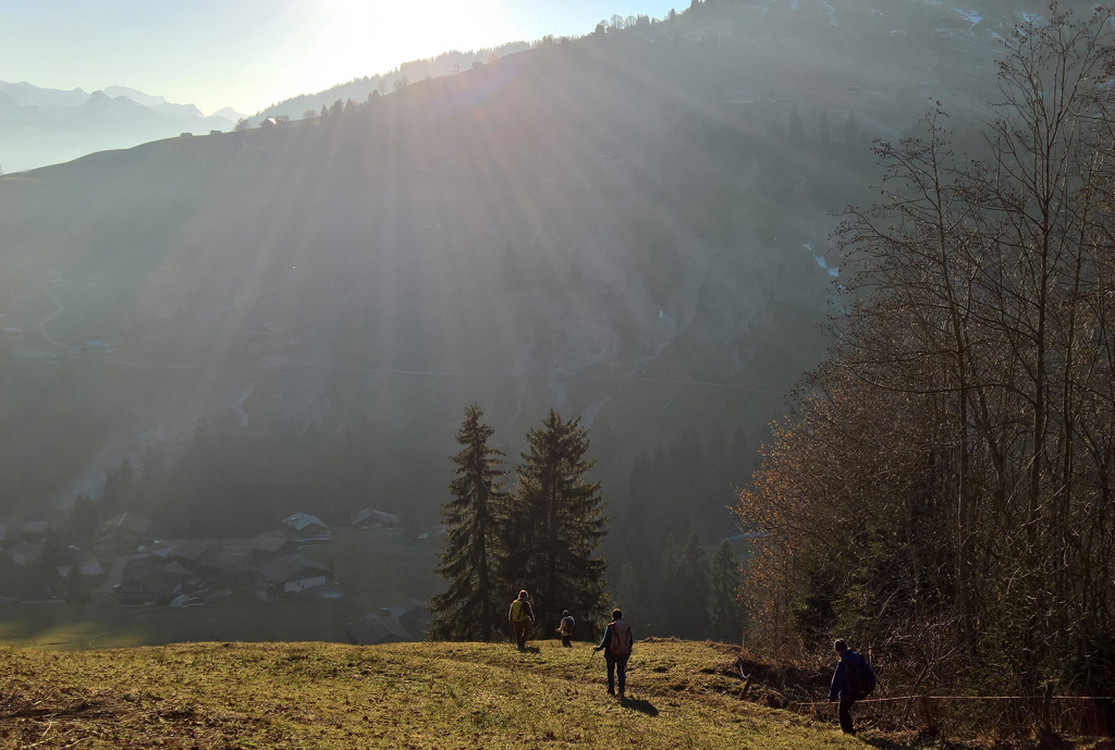 Auf unseren Wegen durchstreiften wir sämtliche Jahreszeiten und Klimazonen: Die Dezembersonne goss fleissig ihr klares Licht auf Wiesen und Wälder – Jacken und Pullis traten sogleich den Rückzug in die Rucksäcke an. Letzte Spätblüher sprossen auf den Weiden, an den Bäumen hatte der Föhn noch etwas Dekorationslaub hängen gelassen. Wo die Sonne nicht hinkam, lag hingegen dicker Raureif und eisiger Schatten. Der Boden knirschte dort brüchig unter den Sohlen.